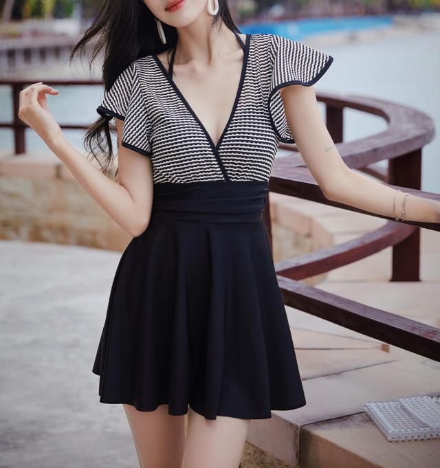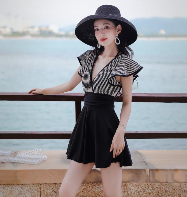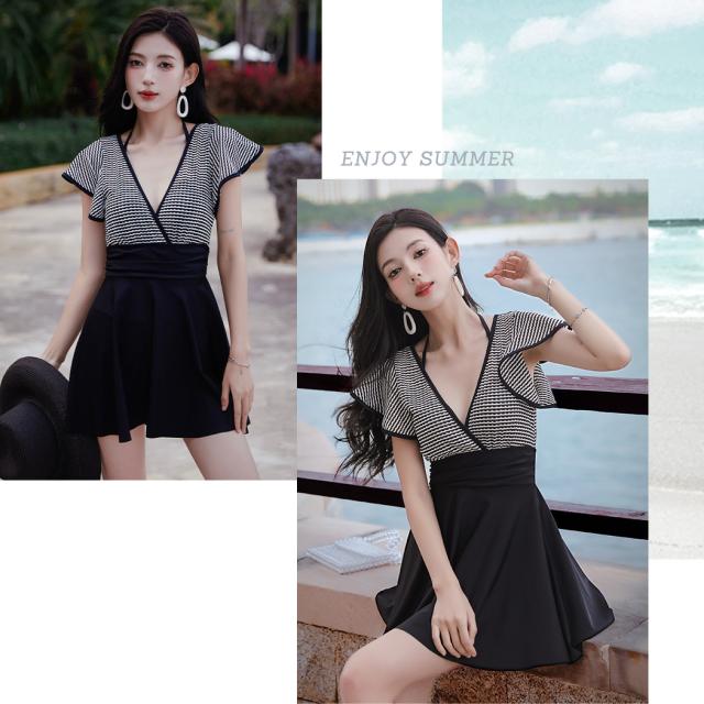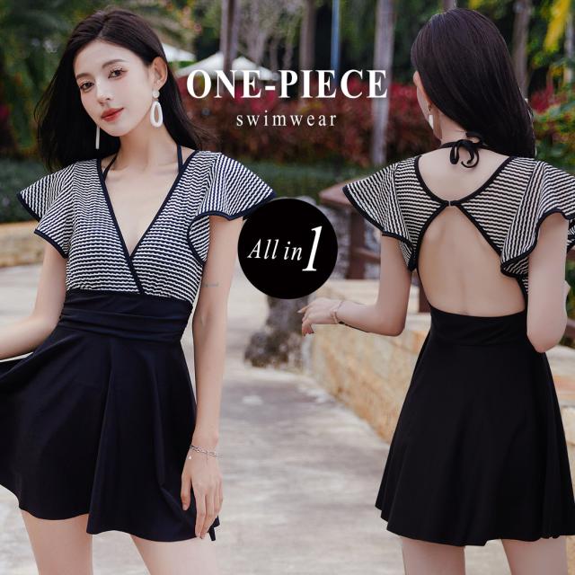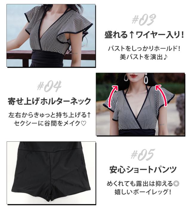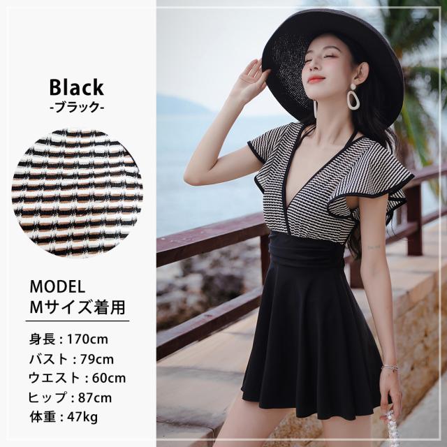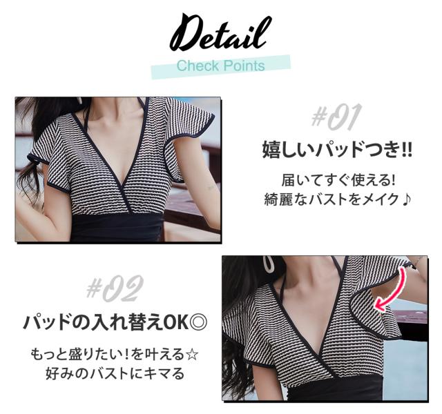 春新作 水着 レディース ワンピース オールインワン 体型カバー 半袖 黒 白 チェック ミックスマッチ おしゃれ かわいい フリル サープリスネック エンジェルスリーブ バックシャン ウエスト 切り替え パッド付き ワイヤーあり 胸