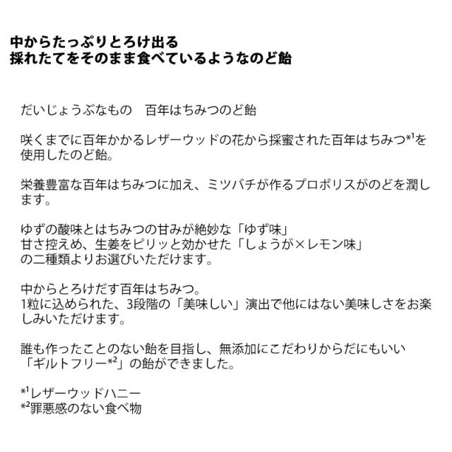 だいじょうぶなもの 百年はちみつのど飴 ゆず味/生姜レモン味 (レザーウッドハニー + ハーブキャンディ) 3個セット (メール便送料無料) のど飴 レザーウッドハニー ハーブキャンディ はちみつ ノンシュガー 美味しい ギルトフリー おやつ