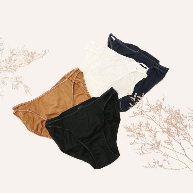 両脇の光沢のあるストラップが大人っぽいショーツ。クロッチ部分は縫い代を減らして、あたりが少ない仕様になっています。スーピマオーガニックコットンの柔らかさが優しく、とても気持ちのいい肌触りです。