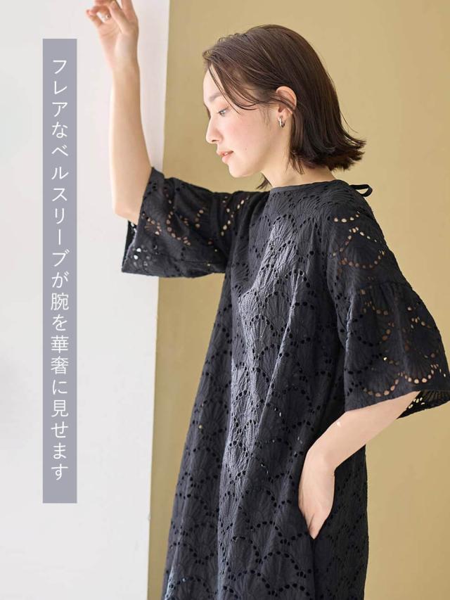 大柄スカラップが印象的なコットンレースを使い、爽やかな印象に仕上げたワンピースです。レースのデザインをいかしたシアー感が涼し気。ボリューム感のあるベルスリーブが腕を華奢に見せて、ゆったりシルエットでも細見えを叶えます。