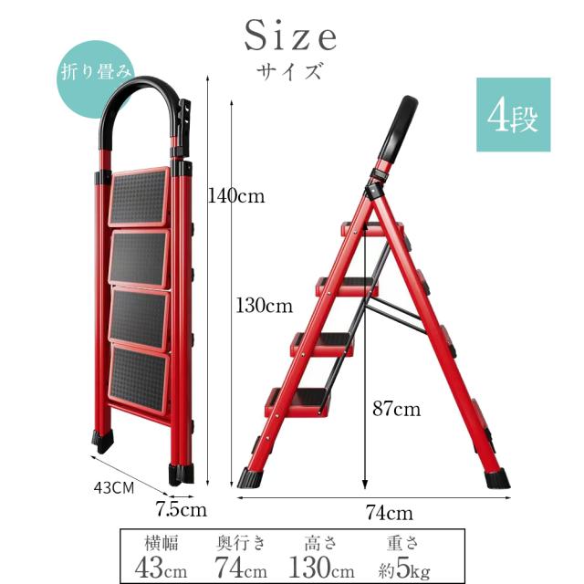 踏み台4段折りたたみタイプの脚立。幅広ステップと滑り止め付きで安心感があり、室内での使用に最適。手すりも付いているので、高い場所でも安全に作業や片付けができます。コンパクトに折り畳めるので、収納場所を取らずにすっきり収納できます。お部屋のお掃除や収納物の取り出し、高い棚の整理に便利なアイテムです。