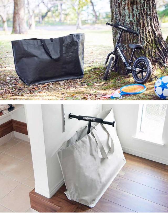 水や泥に強く丈夫なポリエチレンシートのワイドな収納バッグ。 アウトドア用品やSTRIDER(ストライダー)、スポーツアイテムなどの外遊び道具をまとめて保管し、持ち運べます。 張りがありマットな質感のポリエチレンシート生地が泥汚れを防ぐから車に載せても安心、汚れた遊び道具もそのまま室内に持ち込めます。
