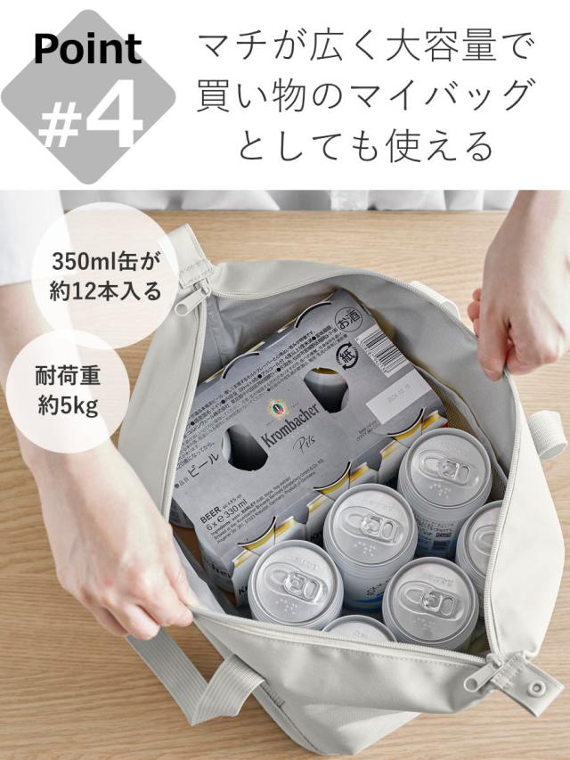 350mL缶が約12本入る大きさなので、買い物のマイバッグとしてもおすすめです。肉や魚のパック、刺身の盛り合わせや寿司、ケーキを買った際、保冷したまま水平に持ち帰ることができます。