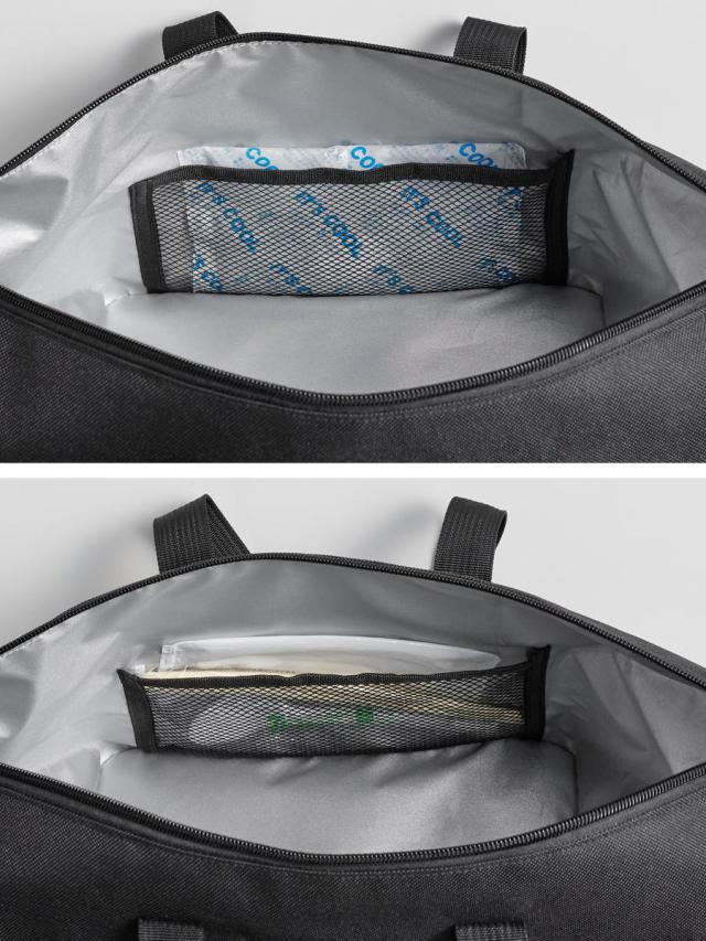 カトラリーや保冷剤が入る、便利なメッシュポケット付きです。