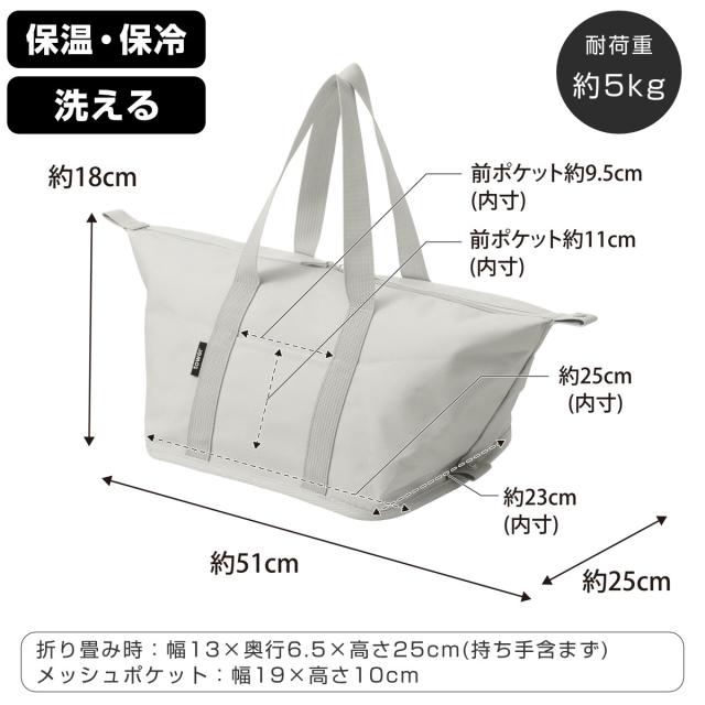 | サイズ | 約 幅51×奥行25×高さ18(cm) ホックを留めない場合:幅51×奥行25×高さ18cm(持ち手含まず) 折り畳み時:幅13×奥行6.5×高さ25cm(持ち手含まず) 内寸 底面:幅25×奥行23cm メッシュポケット:幅19×高さ10cm 前ポケット:幅9.5×高さ11cm |