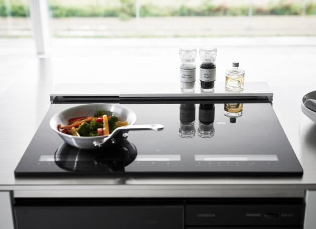 フラットタイプで高さが約2.5cmと低く、目立ちにくいので圧迫感なく置くことができます。また、排気口が隠れることで、コンロ周りをシンプルにスッキリと見せてくれます。