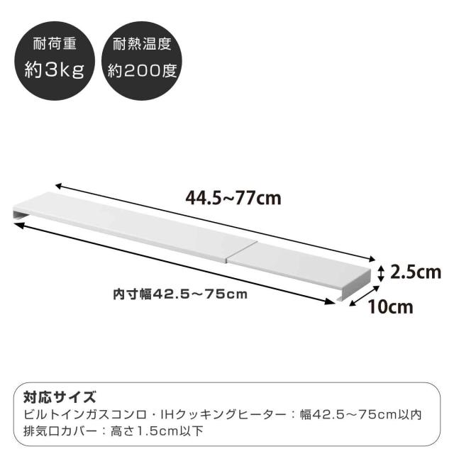 幅42.5〜75cm以内のビルトインガスコンロ・IHクッキングヒーターに対応してます。コンロサイズに合わせて幅を伸縮して調節できるので、ご自宅のコンロにピッタリ設置できます。