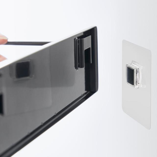 貼ってはがせるフィルムフックなので、接着面をお手入れしていただくと繰り返しお使いいただけます。フィルムを好きなところに貼って、本体を差し込むだけで簡単に設置できます。