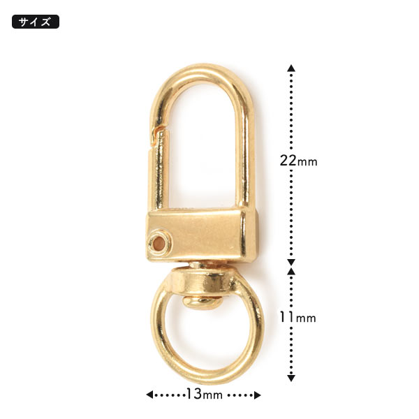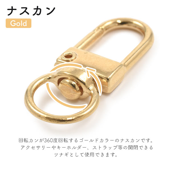 回転カンが360度回転するゴールドカラーのナスカンです。アクセサリーやキーホルダー、ストラップ等の開閉できるツナギとして使用できます。