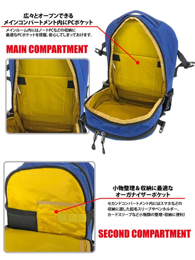 メインコンパートメントにはPCポケット、セカンドコンパートメントにはスマートフォンなどの収納に適した起毛スリーブやペンホルダー、カードスリーブなどタウンユースに便利なポケットを備えています。