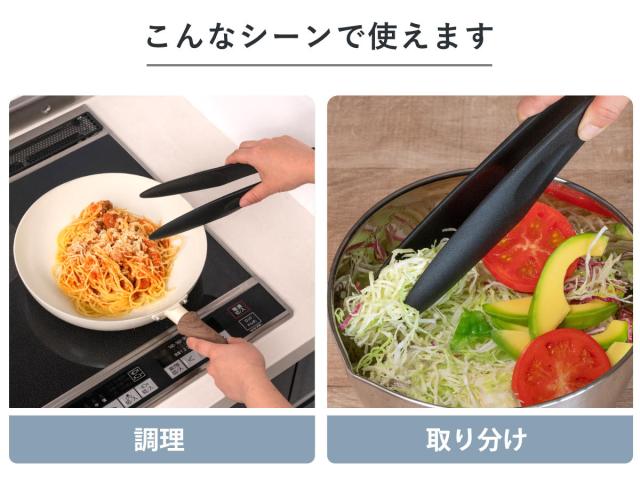 シリコーン製なので、調理にも使えます。さらに、フライパンやボウルなどの調理器具を傷つけないので、安心です。滑りにくいので、細かいものや麺類、サラダなど、色々な食材に使えます。