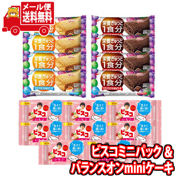 (メール便で全国送料無料) お菓子 詰め合わせ グリコ ビスコミニパック〈いちご〉(8コ)& バランスオンminiケーキ2種(各4コ・計8コ)セット (omtmb9212)【送料無料 お試しセット 個包装 小袋 ばらまき 販促品 景品 問屋 業務