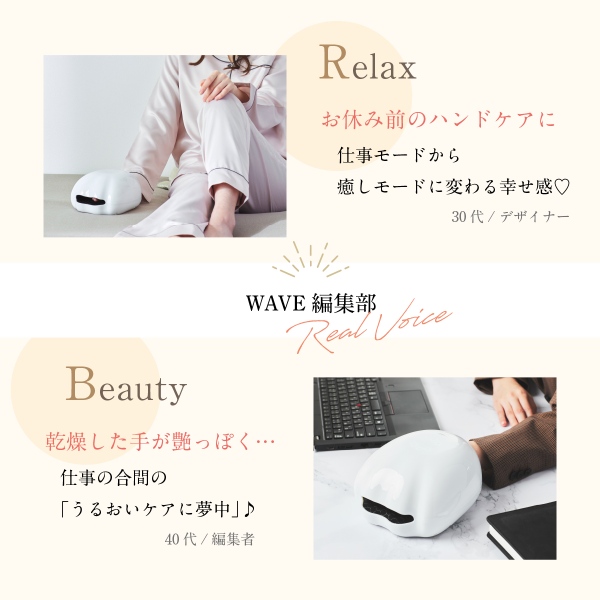 EMS×温熱×エアプレスで手全体を包み込んでほぐしてくれるだけでなく、年齢の出やすいハンドへのお手軽な美容ケアとしても。