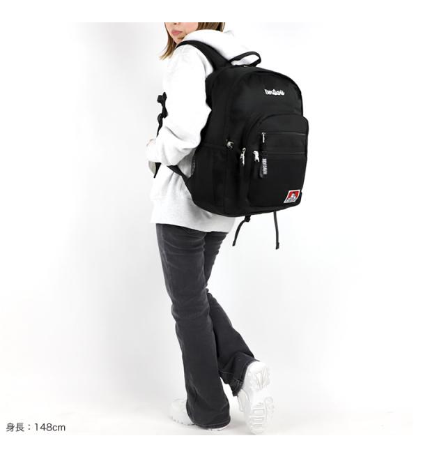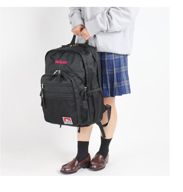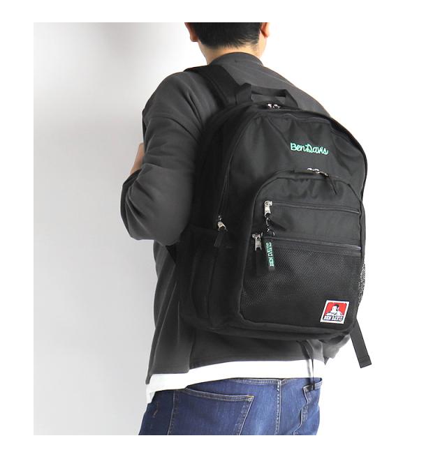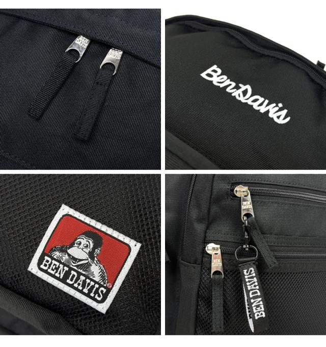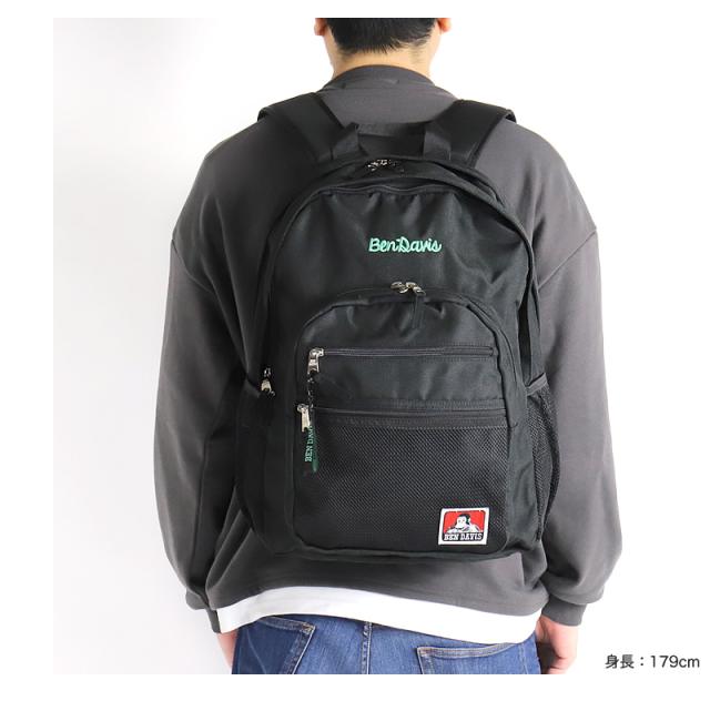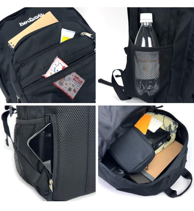 メッシュポケットが目をひく、シンプルなデザインのデイパック。 Ben Davisの筆記体刺繍がポイント。 B4サイズ収納可能。 生地には撥水加工も施されています。 メインスペースはクッショニングPCスリーブ付き。仕切りも少なくたっぷり入るのが特徴的です。 背中側についているセキュリティポケットはお財布やスマホなど貴重品の収納に役立ちます。 チェストベルト付きで上下高さ調整、幅開整もできるので体型に合わせた使用が可能。 肩ショルダー部分はプラスチックDカンがついているので、キーホルダなどをつけて楽しめます。 背面の方にある荷物も取り出しやすいようにメインルームの開口部は上部2か所アクセス可能! 通勤通学におすすめのアイテムです♪