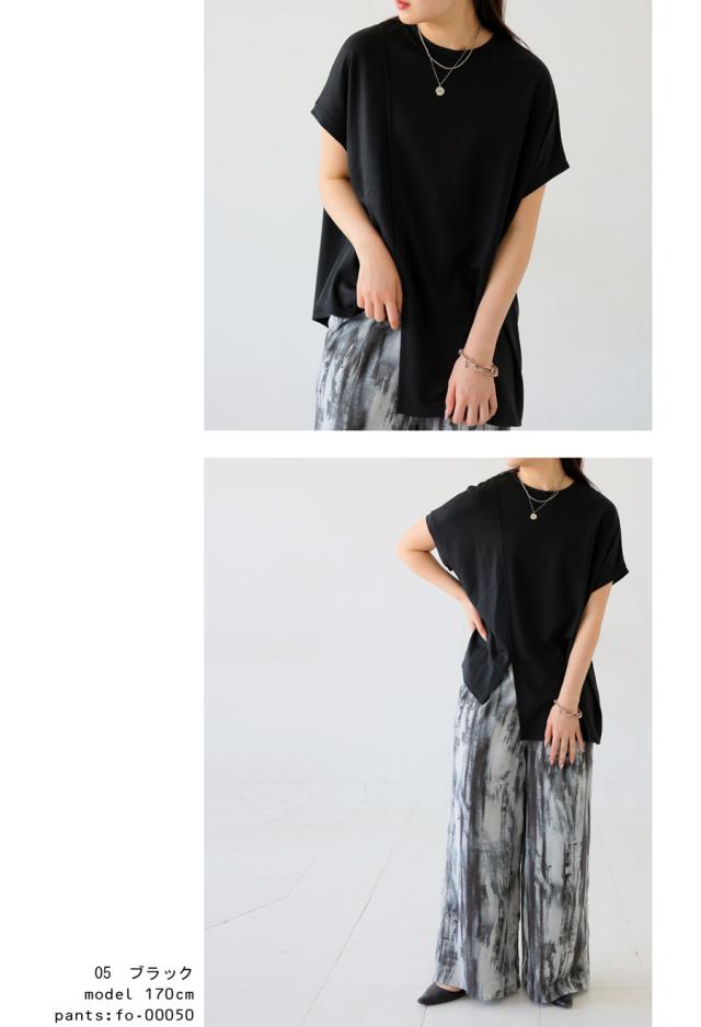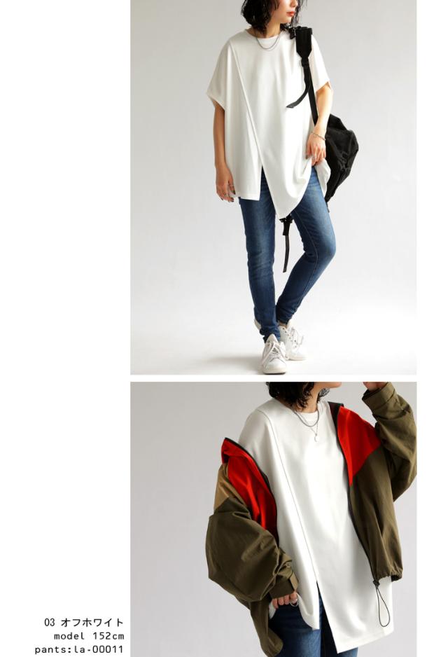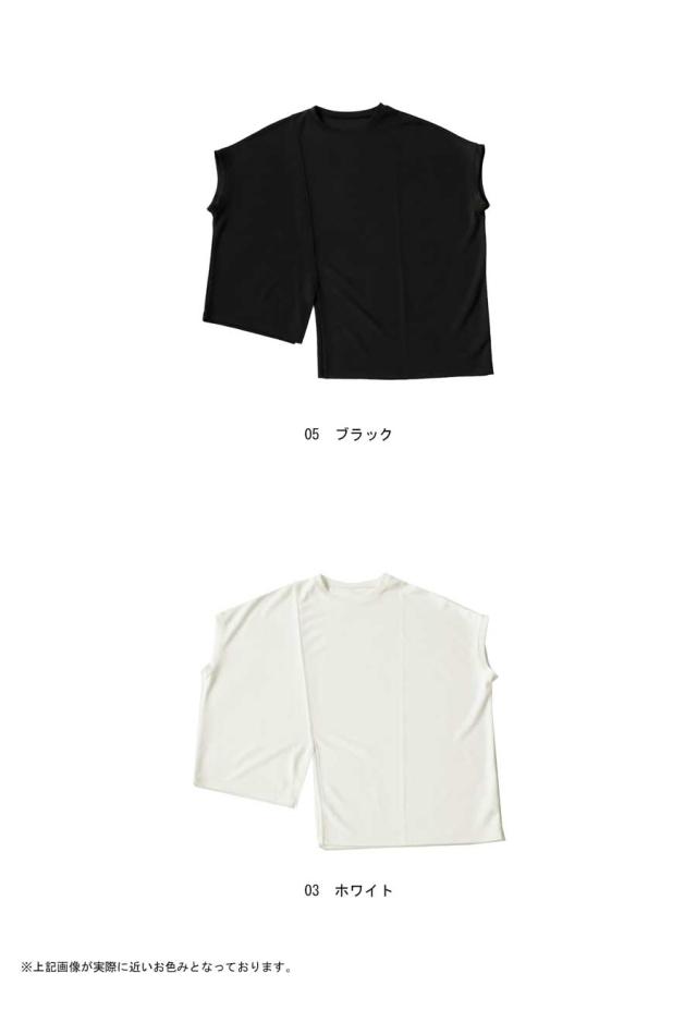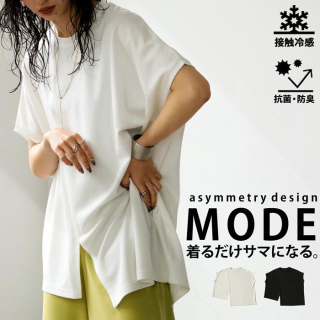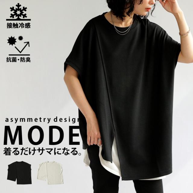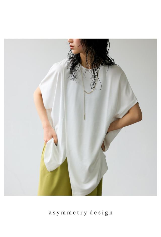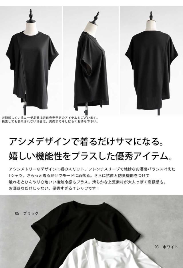 pn-00468 接触冷感 抗菌防臭 無地 フレンチスリーブ 丸首 アシメ 変形 スリット ダンボール生地 レーヨン混 ゆったり シンプル モード レイヤード デザイントップス Tシャツ