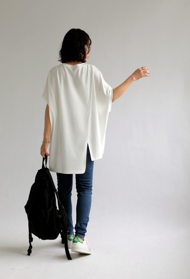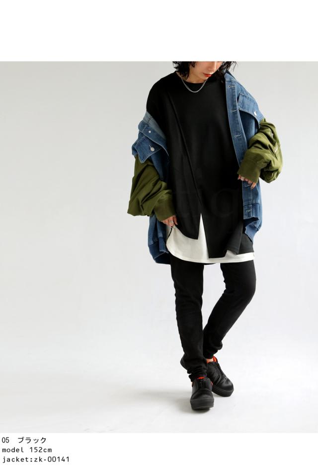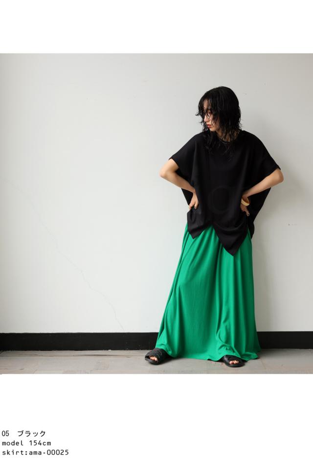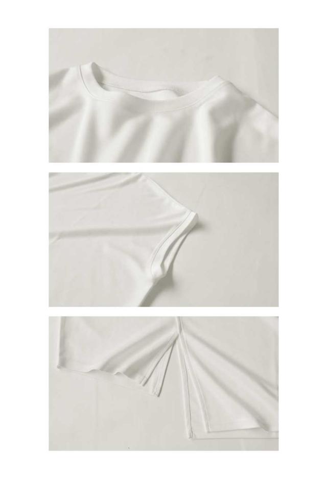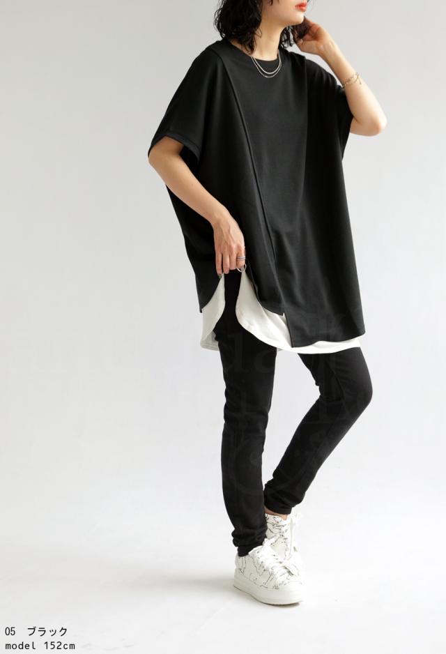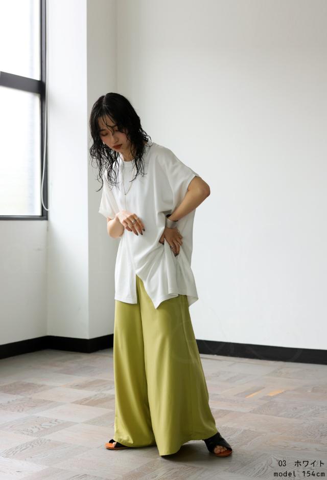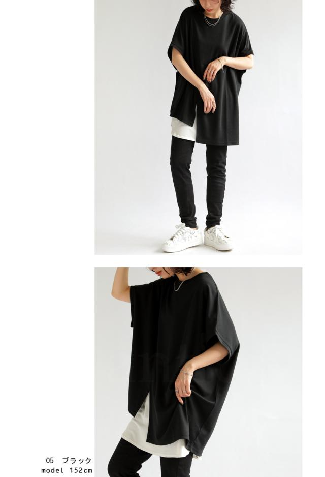 pn-00468 接触冷感 抗菌防臭 無地 フレンチスリーブ 丸首 アシメ 変形 スリット ダンボール生地 レーヨン混 ゆったり シンプル モード レイヤード デザイントップス Tシャツ