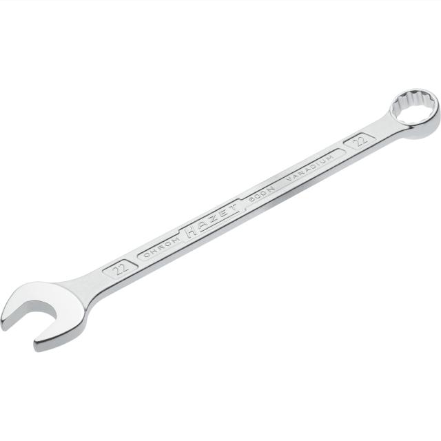 HAZET コンビネーションスパナ; 品番 600N-22; EAN: 4000896023158; 用途: ロングスリムデザインスリムヘッド; 安定したHAZETダブルTプロファイルシャフト; コンビネーションスパナヘッド角度15°; 表面:クロムメッキ、ヘッド研磨; DIN 3113フォームA、ISO 3318、ISO 7738; ドイツ製; 出力:外側ダブル六角牽引プロファイル; フラット幅:22 mm; 寸法/長さ:304.5 mm; 正味重