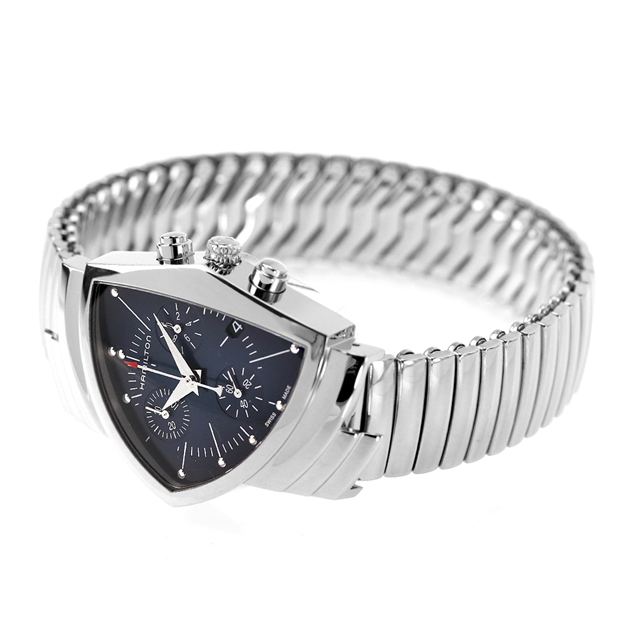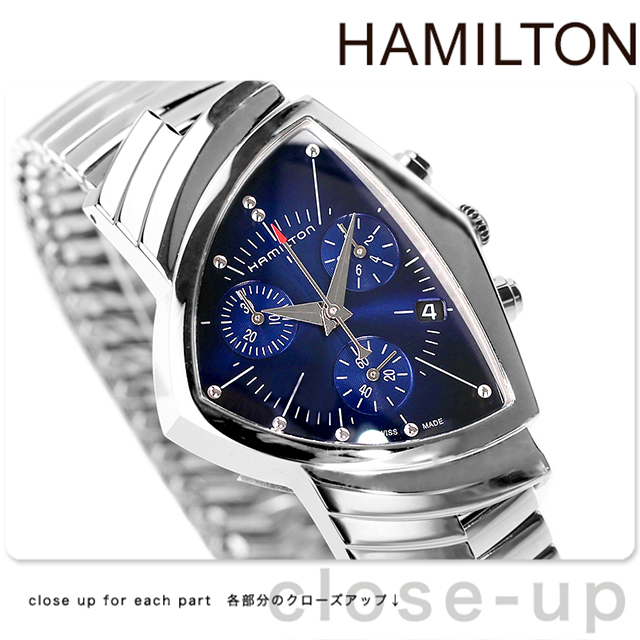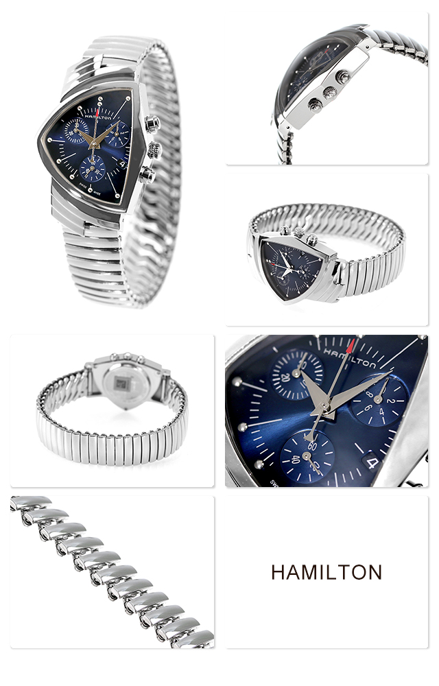 3年保証キャンペーン ハミルトン ベンチュラ クロノ 32mm クロノグラフ スイス製 メンズ 腕時計 H24432141 HAMILTON VENTURA CHRONO アナログ ブルー ◆HAMILTON(ハミルトン)はアメリカ発祥の老舗ブランドです。創業翌年に誕生した懐中時計「ブロードウェイ・リミテッド」は、他の時計よりも正確に時を刻むことから鉄道用時計として採用されました。その後も航空用時計や軍用時計として採用されるなど、品質の高さと流行にながされない独自のデザインが世界中の人々に支持されています。 時計史上の革命児「ベンチュラ」。常識とかけ離れた左右非対称のフォルムは、保守的なデザインが主流であった時計業界に波紋を投げかけ、デザインウォッチの先駆けとして後世に大きな影響を及ぼしました。エルヴィス・プレスリーの大ヒットシングル『ブルー・スエード・シューズ』にインスパイアされた「ベンチュラ クロノ クォーツ」は、時、分、秒を計測する3つのサブダイヤルを配したグラデーションブルーのダイヤルを備えてます。