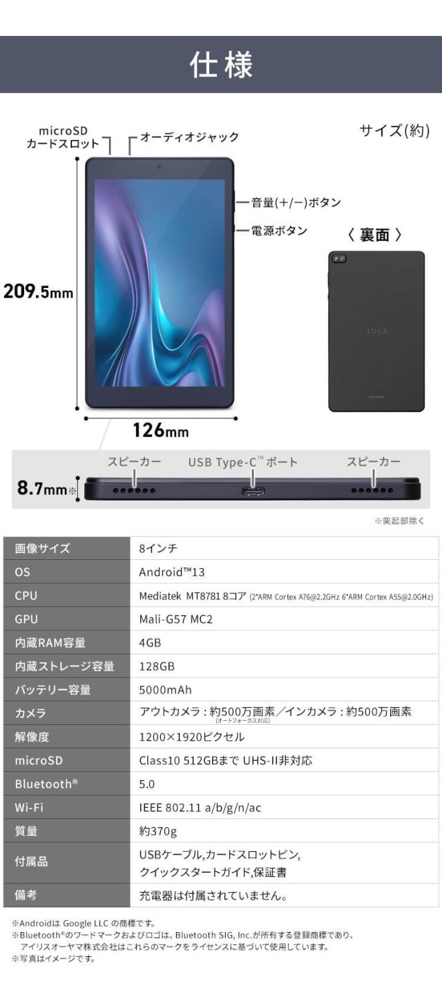 タブレット 新品 本体 8インチ TM083N4V1-B ブラック LUCA アンドロイド wi-fi 端末 android tablet 1200×1920 128gb コンパクト 軽量 アイリスオーヤマ 送料無料