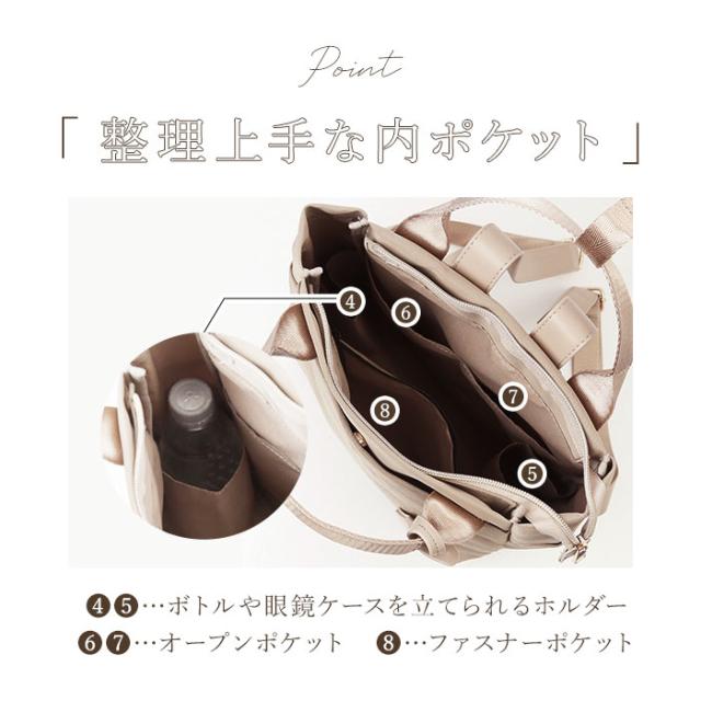 | 商品説明 | ・デイリーユースにピッタリ!キーチャーム付きのトートリュックが発売♪ 【通勤・通学用に】 ・メインルームはA4サイズ収納可能◎教科書やファイル、仕事用の小物を持ち運ぶのにもピッタリなサイズ感。 【幅広いシーンで活躍】 ・シンプルなデザインで幅広いシーンに対応!タウンやアクティブシーンにも。コーデを選ばないのも嬉しいポイント。 【トートバッグとしても】 ・リュックとして使うのはもちろん、トートバッグとしても使える◎ 【ポケット充実】 ・内側・外側にポケットを多数搭載。小物が多くなっても整理しながら収納可能。 【ペットボトルや折り畳み傘の収納も♪】 ・内側サイドのオープンポケットは、ホルダー設計になっており、折り畳み傘やペットボトルを自立させて収納できる。 【濡れても汚れても慌てない】 ・汚れや水滴に強い撥水加工済み。濡れたり、汚れてもサッと拭き取りだけでOK!急な小雨にも対応。 【背面ポケット付き】 ・ミニウォレットやパスケースが丁度よく入る背面ポケット付き。 【大人女子にもおススメ♪】 ・程よい光沢感が特徴的なナイロン素材。ゴールドパーツとフェイクレザーのポイント使いで上品な印象をさらにプラスし、持っているだけでおしゃれ度アップ♪ 【ポケット仕様】 ・メインルーム・・・オープンポケット×2、ホルダーポケット×2、ファスナーポケット×1 ・フロント・・・マグネット付きポケット×1 ・両サイド・・・オープンポケット×1ずつ ・背面・・・ファスナーポケット×1 |