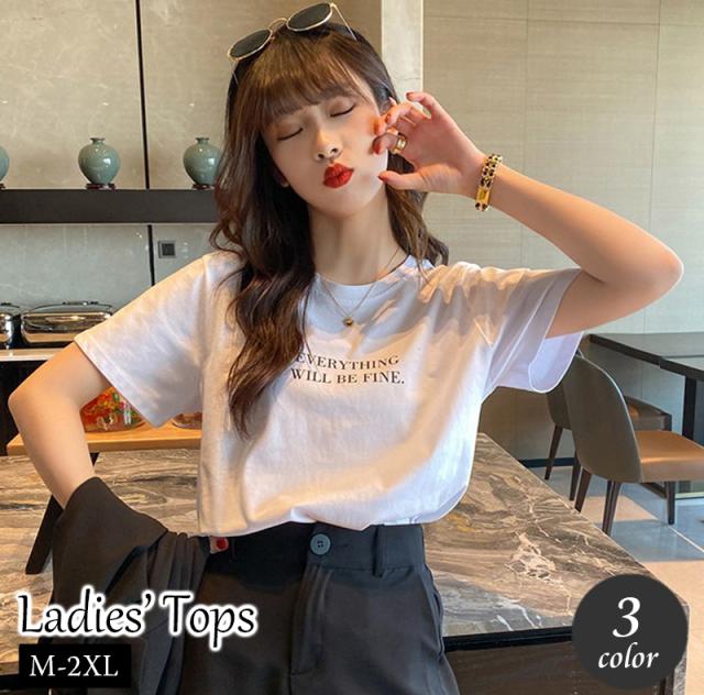 Tシャツ 半袖 レディース 女性用 クルーネック 英字 ロゴ入り ラウンドネック トップス 大きいサイズ有り シンプル カジュア
