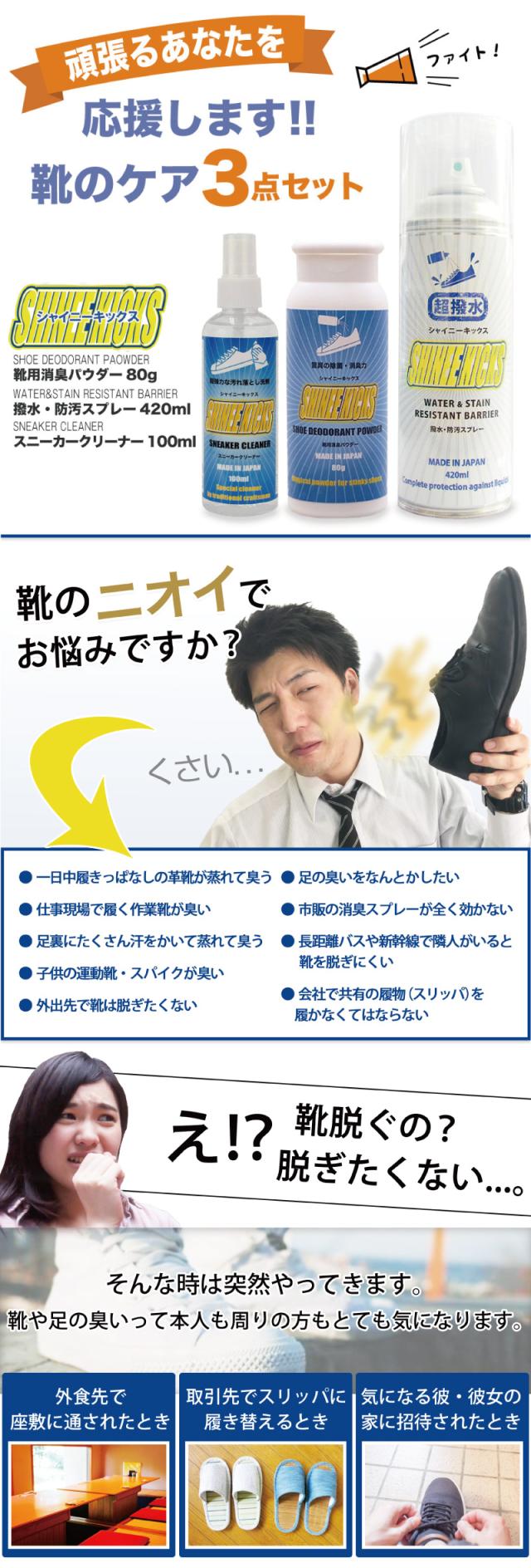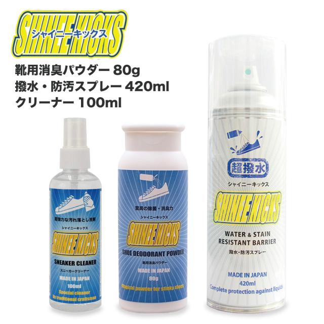靴のケア用品 消臭パウダー+防汚・撥水スプレー+靴専用クリーナー [シャイニーキックス3点セット] 足 粉 日本製 靴消臭剤 大容量 足汗や蒸れでクサイ靴に振りかけるだけ 蒸れ ブーツ スニーカー エアゾールスプレー 防水