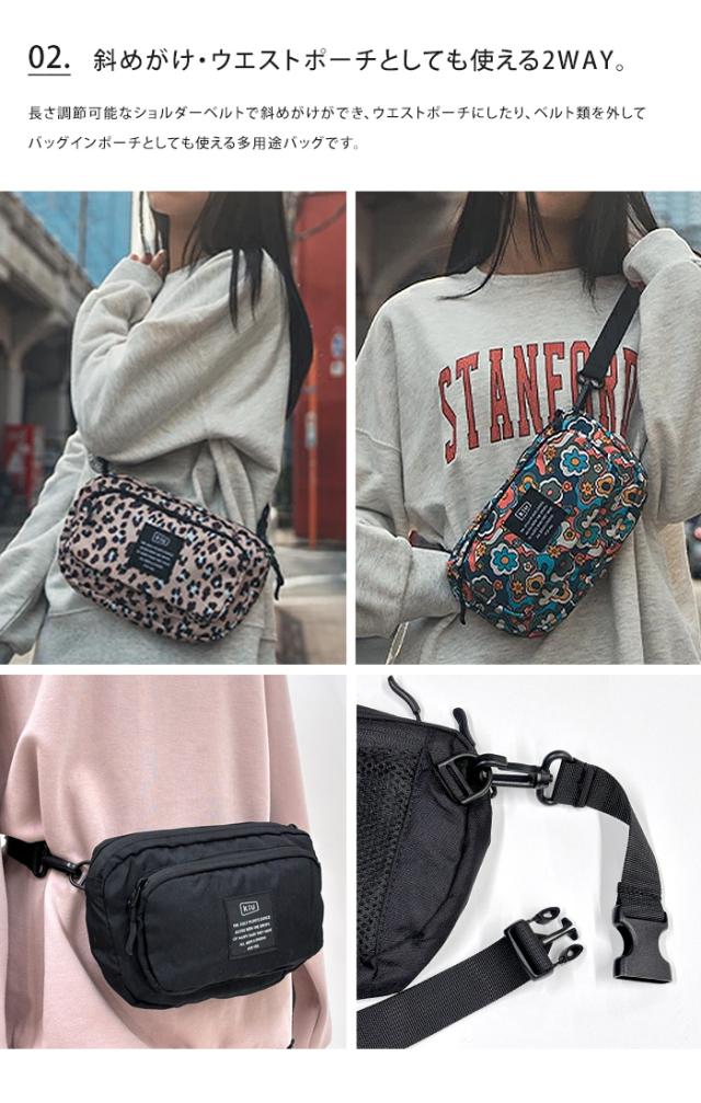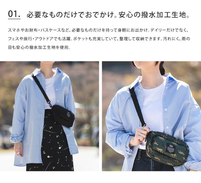 スマホやお財布・パスケースなど、必要なものだけを持って身軽にお出かけ。デイリーだけでなく、フェスや旅行・アウトドアでも活躍。ポケットも充実していて、整理して収納できます。汚れにく、雨の日も安心の撥水加工生地を使用。長さ調節可能なショルダーベルトで斜めがけができ、ウエストポーチにしたり、ベルト類を外してバッグインポーチとしても使える多用途バッグです。