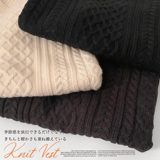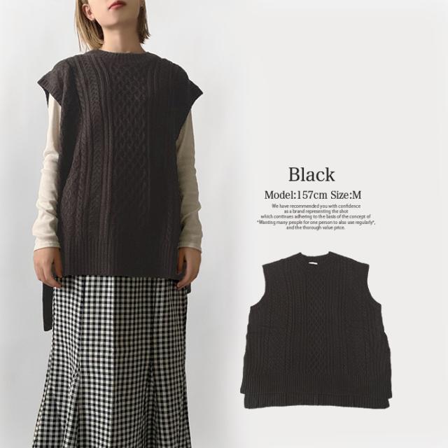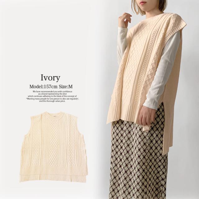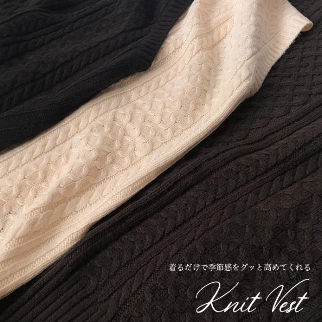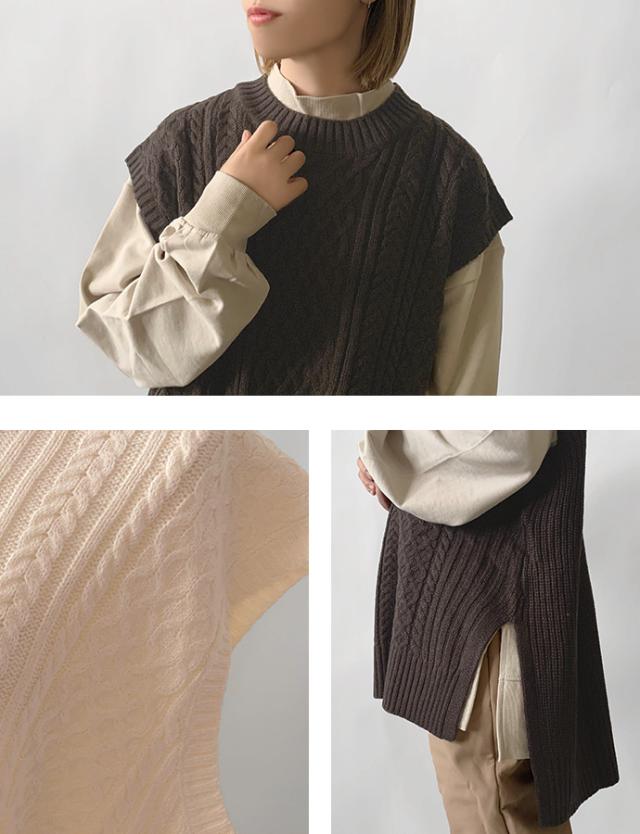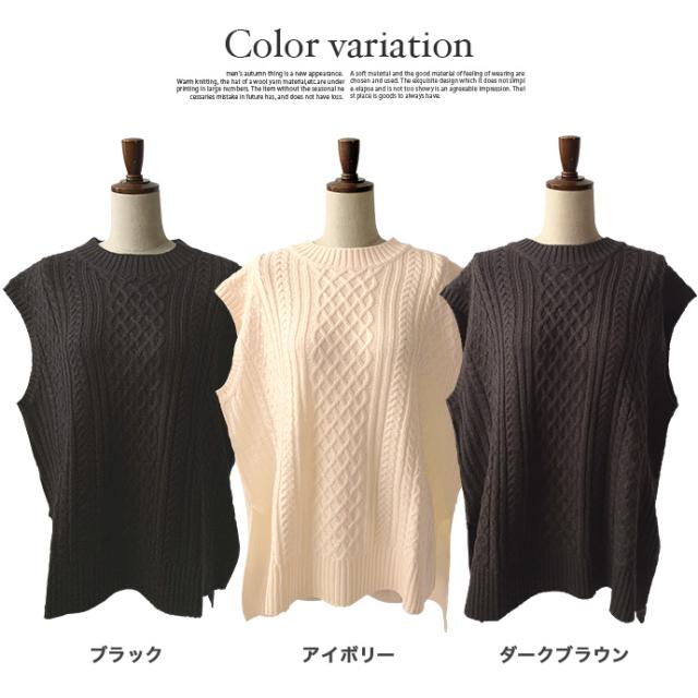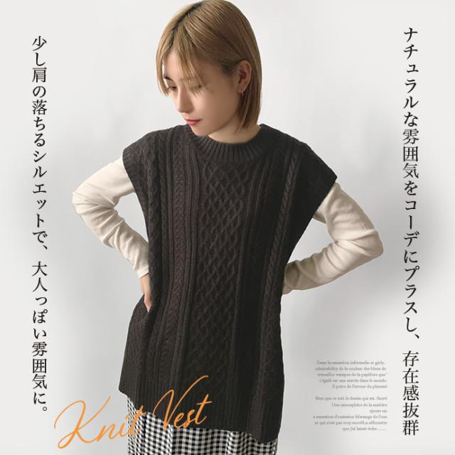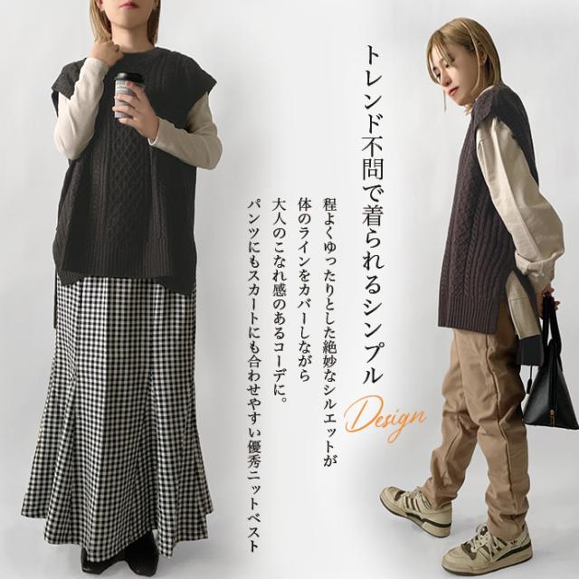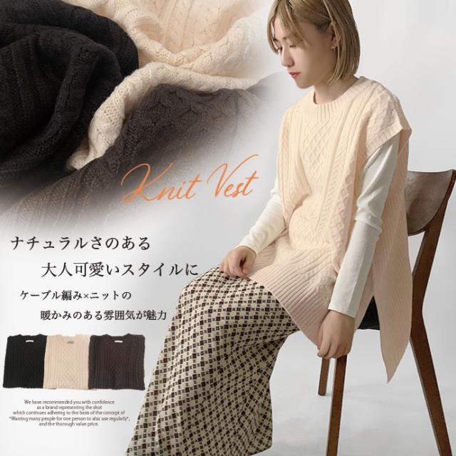 ベスト ニットベスト ノースリーブ ケーブル編み リブ編み セーター 重ね着 レイヤード クルーネック ゆったり レディース 送料無料