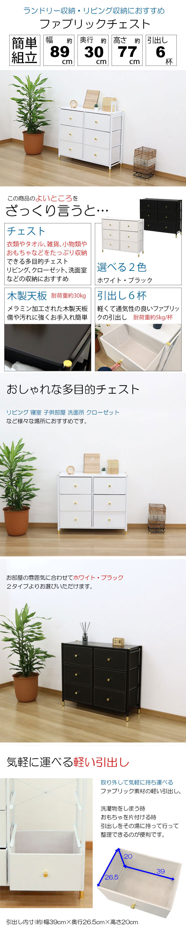 ファブリック素材の軽い引出し6杯
