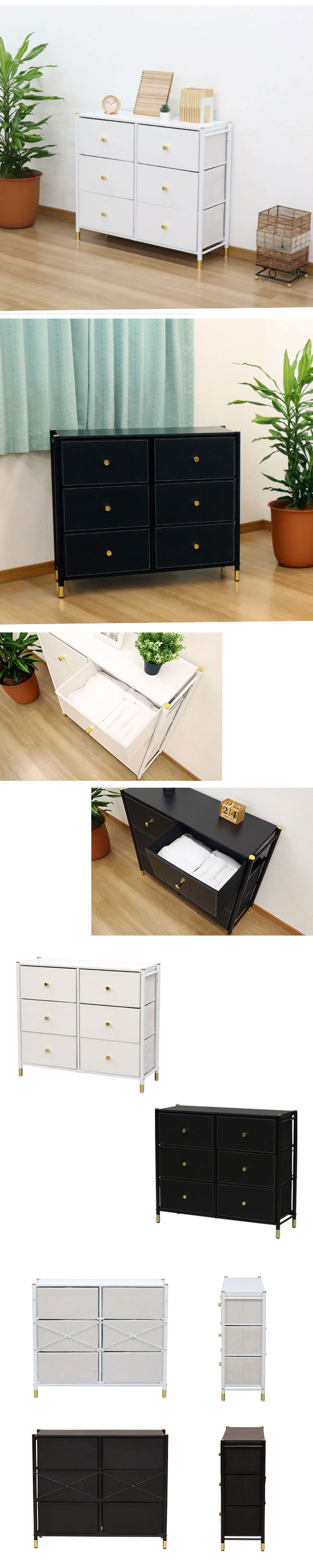 チェスト 3段 2列 前面フェイクレザー 通気性 ファブリック引き出し 木製天板 幅88.5cm(約90cm) 奥行30cm 高さ76.6cm(約80cm) アジャスター付き スチールレール ホワイトチェスト×ゴールド ブラックチェスト×ゴールド 合皮 衣類収納 衣装ケース 衣類ケース リビング収納