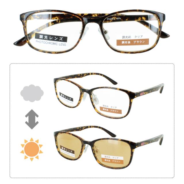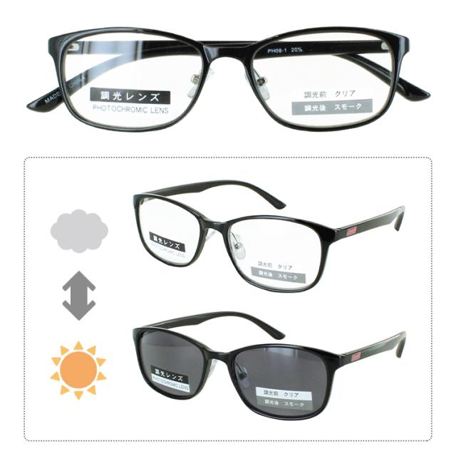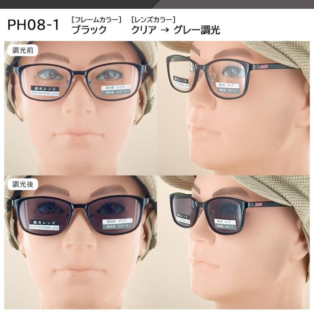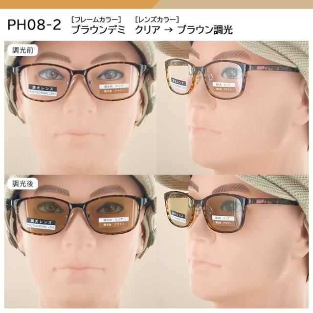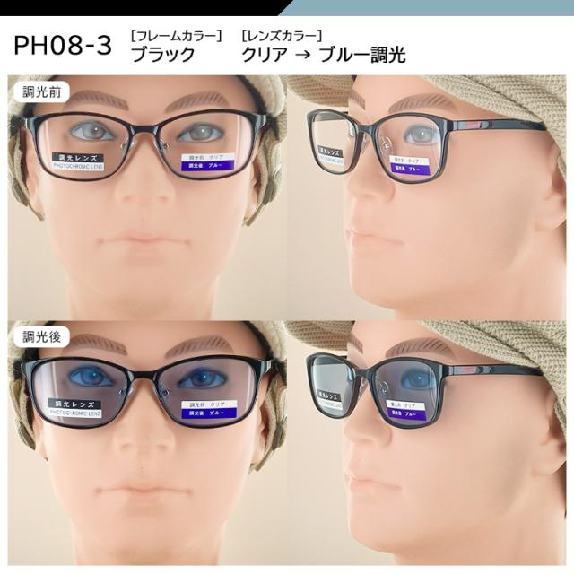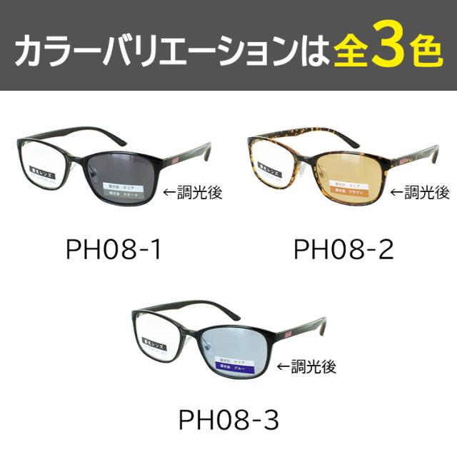 | ●カラー PH08-1 フレーム:ブラック レンズ:クリア→グレー調光 PH08-2 フレーム:ブラウンデミ レンズ:クリア→ブラウン調光 PH08-3 フレーム:ブラック レンズ:クリア→ブルー調光 | ●素材 フレーム:プラスチック テンプル:プラスチック レンズ:プラスチック(調光レンズ) ●可視光線透過率 PH08-1 調光前 87%、調光後20% PH08-2 調光前 87%、調光後30% PH08-3 調光前 87%、調光後30% ●機能 調光レンズ クリングス鼻パッド |