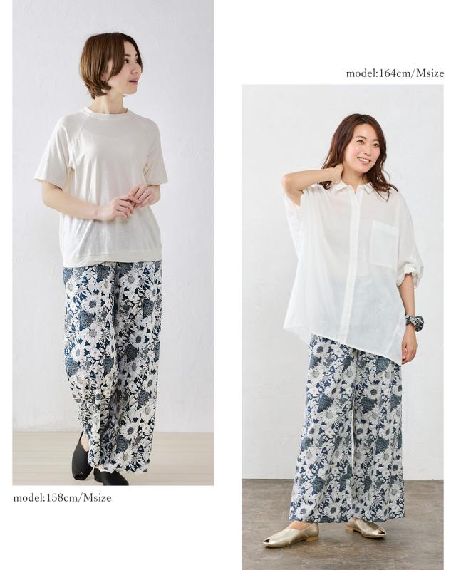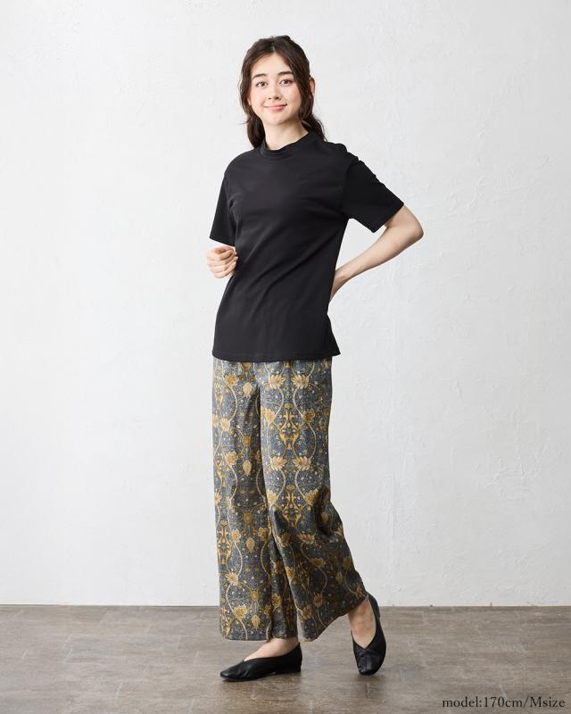 品よく華やぐ、リバティプリント生地を使用したワイドパンツ。