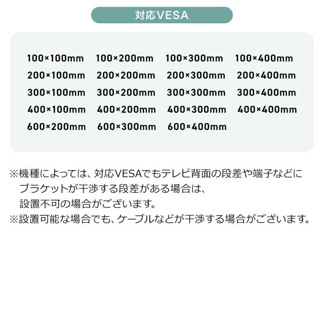 ■対応VESA:100×100、100×200、100×300、100×400、200×100、200×200、200×300、200×400、300×100、300×200、300×300、300×400、400×100、400×200、400×300、400×400、600×200、600×300、600×400