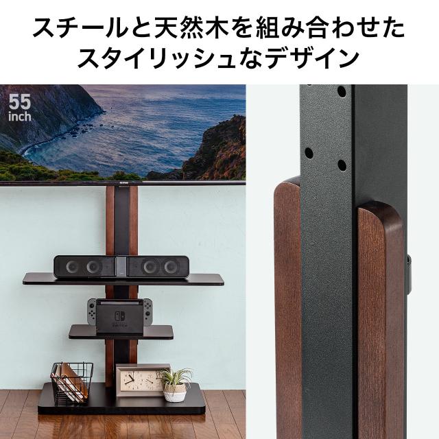 ⇒ご購入の前にご確認下さいスチールと天然木(ビーチ)を組み合わせたスタイリッシュなデザインかつ、スリムなフレームを採用した壁寄せテレビスタンド。小型サウンドバーの設置にも対応する棚板付き。最大65インチまで対応したハイタイプのテレビスタンド。【WEB限定商品】