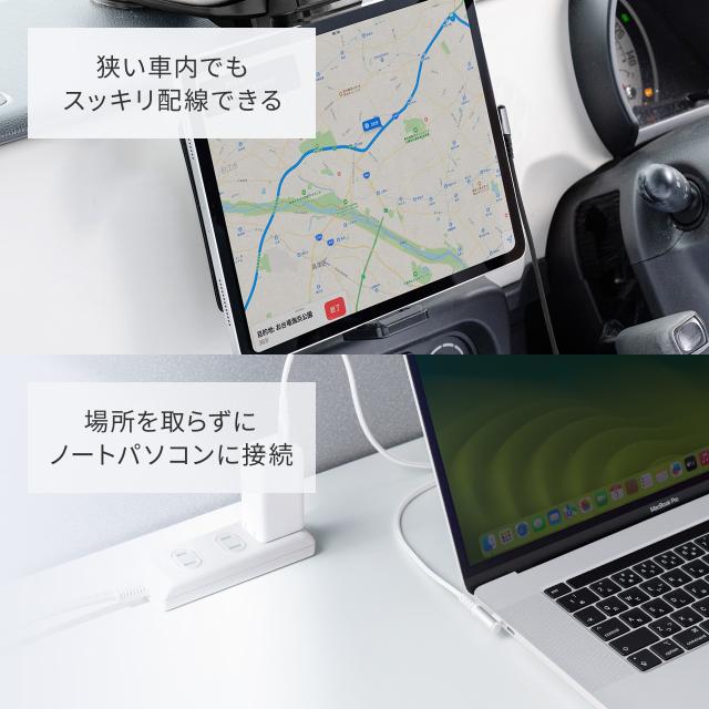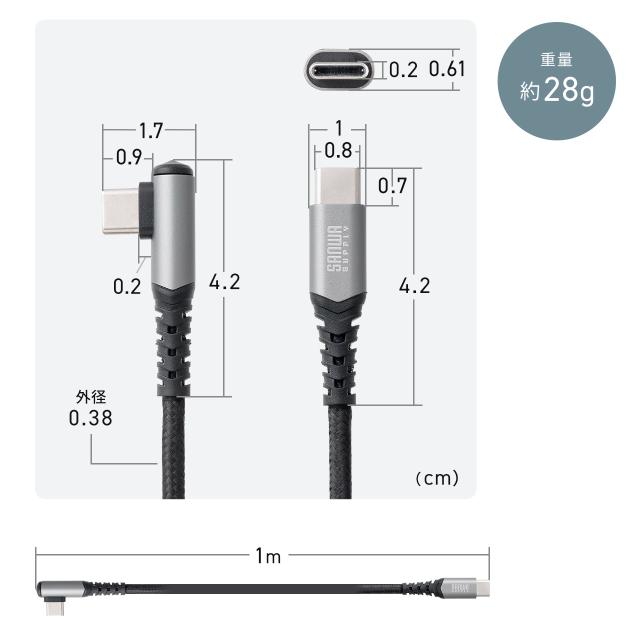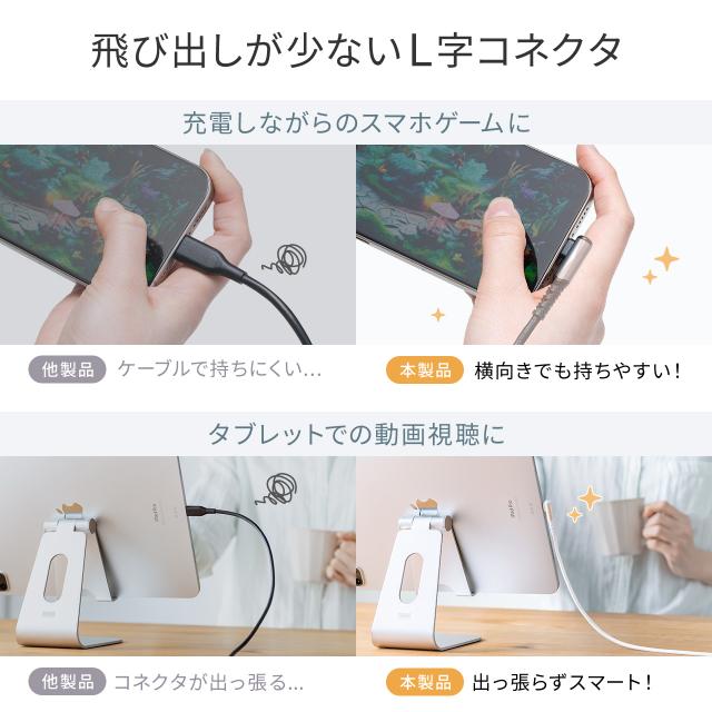 ●片側にL型コネクタを採用したUSB Type-Cオス/Type-Cオスケーブルです。●飛び出しが少ないL字コネクタは充電しながらのスマホゲームやタブレットでの動画視聴に最適です。