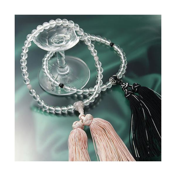 透明感のある水晶をベースに、女性におすすめの【ローズクォーツ】、男性らしい(女性でもOK)【オニキス】をあしらった上品なデザインにも注目。厳かなシーンにも悪目立ちしない洗練された雰囲気はさすが!さらに、ひときわ大きい中央部の石には手の込んだ飾りがほどこされ、高級感たっぷり。こういったデザインのものは手間がかかるのでレアなんです。サッと取り出したときに品格が感じられそうですよね。