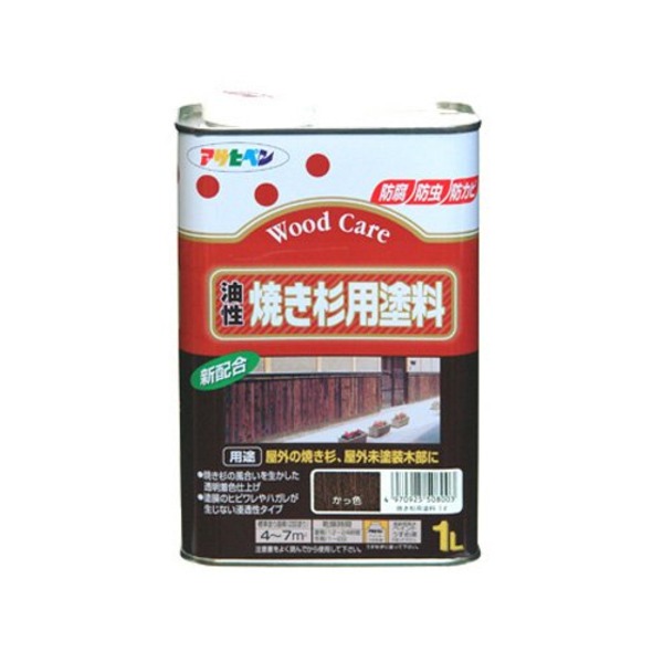 夏でも冬でも使える 速乾性の油性塗料で、焼き杉を美しく仕上げる かっ色 1L 乾燥時間は夏期でもたったの12?24時間、冬期でも2?3日 の高品質塗料で、素敵な仕上がりを実現します 油性焼き杉用塗料 かっ色 1L