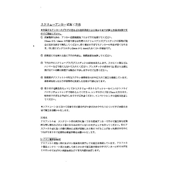 【特記事項】アスファルト面施工時はエポキシ接着剤の併用を推奨しています。同封する施工書に沿った施工をお願いいたします。