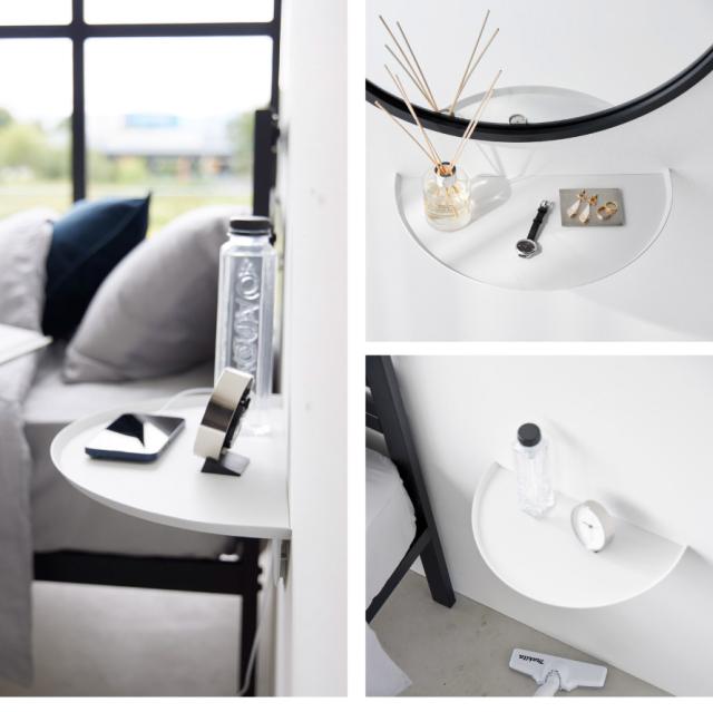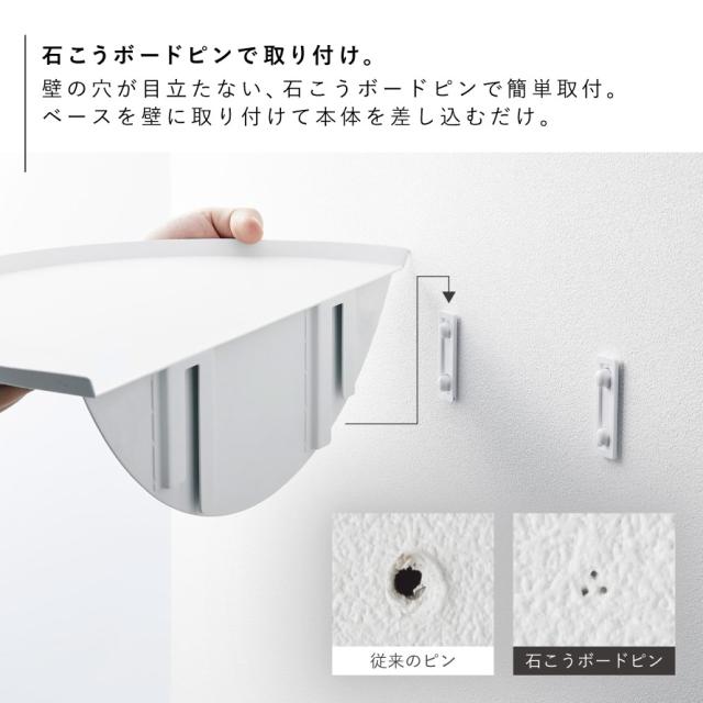 壁の穴が目立ちにくい石こうボードピンで浮かせて取り付けできるサイドテーブル。壁の穴が目立ちにくい石こうボードピンで壁に取り付け可能。取り付けベースを壁に取り付けて本体を差し込むだけ。付属の木ネジでも取り付け可能です。