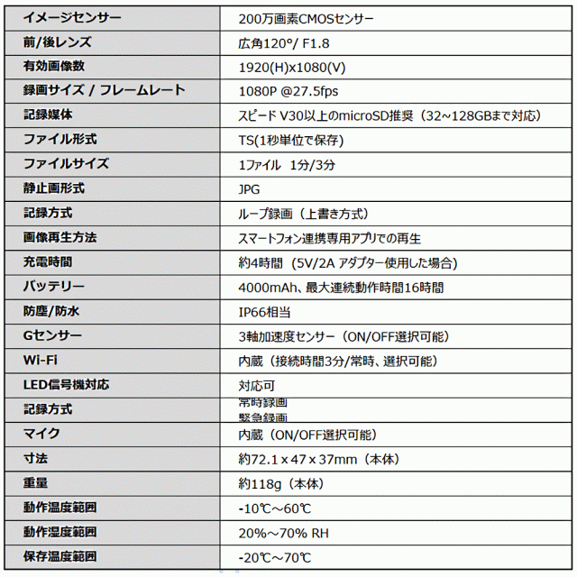 - 大容量バッテリー内蔵で最大16時間連続録画可能。200万画素カメラでFull HD以上の高画質録画、全国のLED信号機にも対応。「スマート感知センサー」で、カメラ本体の着脱で、自動で電源オン/オフします。IP66レベルの防塵&防水性能でゲリラ豪雨でも心配なし。手のひらサイズなので持ち運びにも便利