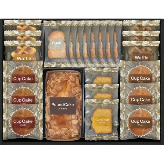 ラスク(シュガー・ココナッツ)×各4、カップケーキ(プレーン・メープル)・ワッフル(プレーン・チョコ)・レモンケーキ×各3、アーモンドパウンドケーキ×1