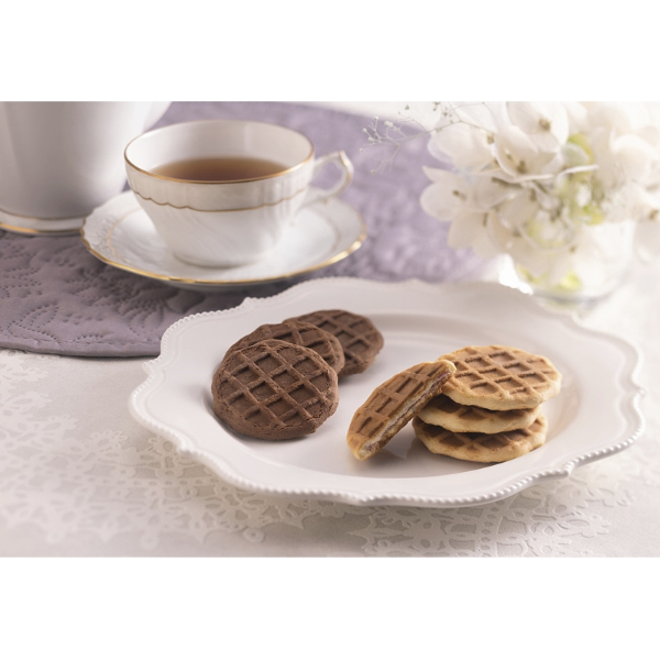サクサク食感のワッフルクッキーにホワイトチョコクリームを詰めた風味豊かなショコラワッフルクッキーといちごチョコクリームを詰めたいちごワッフルクッキーの詰合せです。