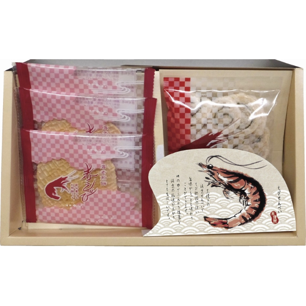 赤えび(1枚)×3、えびせん(うずまき)(10g)×1