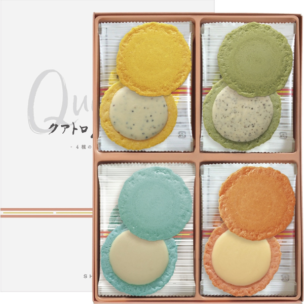 クアトロ(QUATTRO)とは、イタリア語で「4」を表す言葉。志満秀オリジナルの4種のチーズクリームをえびせんべいでサンド。例えばモッツァレラとバジル、ブルーチーズと蜂蜜はイタリア料理でおなじみのコンビ。お気に入りのワインのおともに、またパーティやお茶会など様々なシーンでお楽しみいただけます。