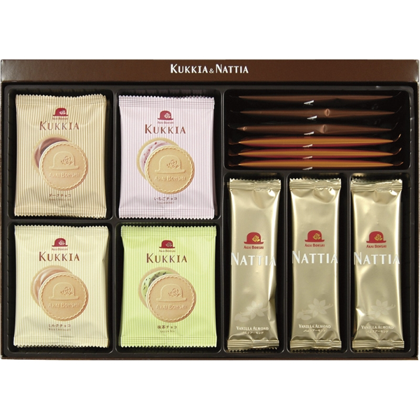 ナッティア(バニラアーモンド)×9、クッキア(ミルクチョコ・ダークチョコ・いちごチョコ・抹茶チョコ)×各5、