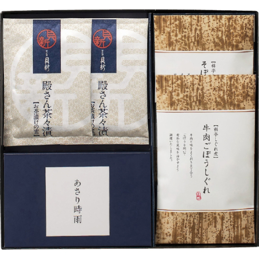 新之助貝新殿さん茶々漬(5g)・あさりしぐれ(10g)×各2、柿安本店料亭(牛肉ごぼうしぐれ煮・そぼろ味噌味合わせ)(各50g)×各1