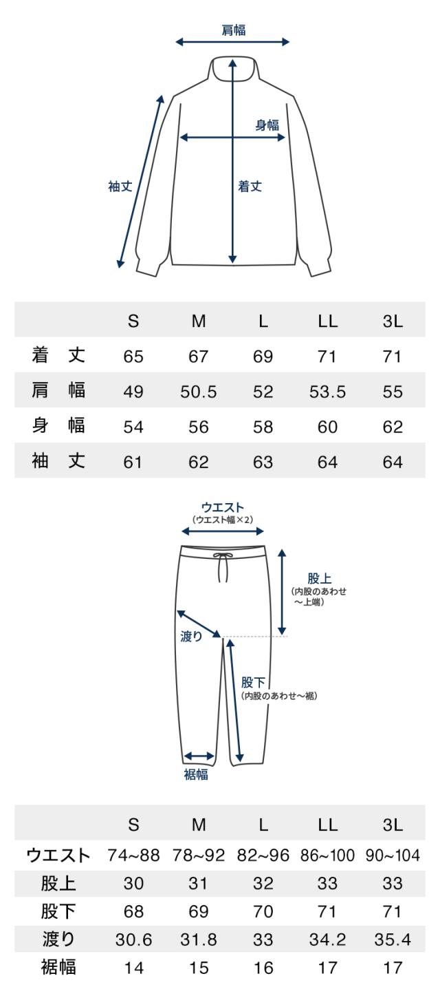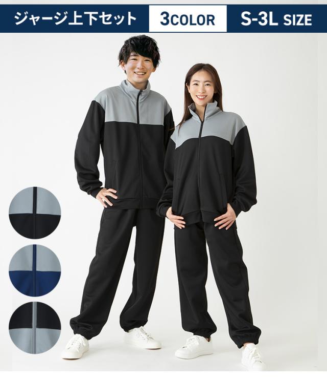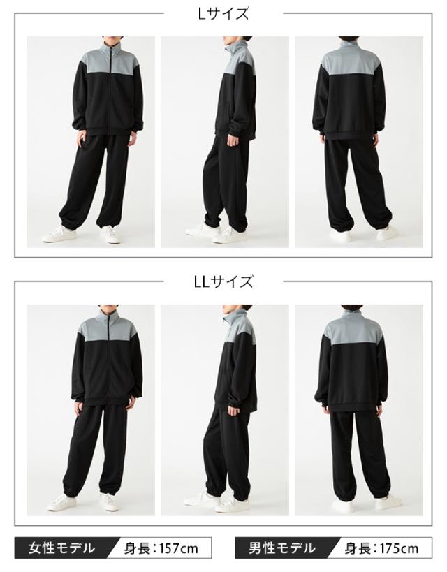 ジャージ上下セット。トップスは切り替えの配色で、ジップアップ仕様。