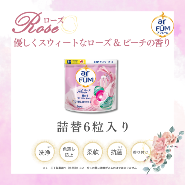 【50%OFFセール中】アフューム 洗濯洗剤 柔軟剤入り洗剤 ローズ 詰め替え 6粒 優しいピーチの香り ジェルボール お試し 消臭 抗菌 洗剤 王子製薬