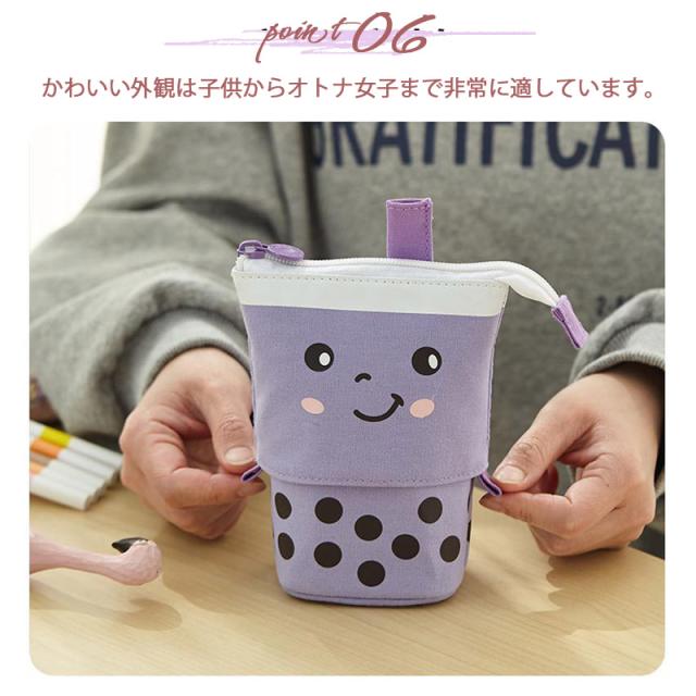・タピオカミルクティーデザインの伸縮できる自立式ペンポーチ。
