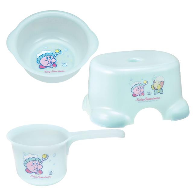 バスタイムを楽しむカービィが描かれた洗面器、風呂いす、片手おけの同シリーズで揃えると統一感が出て毎日のお風呂が楽しくなります。